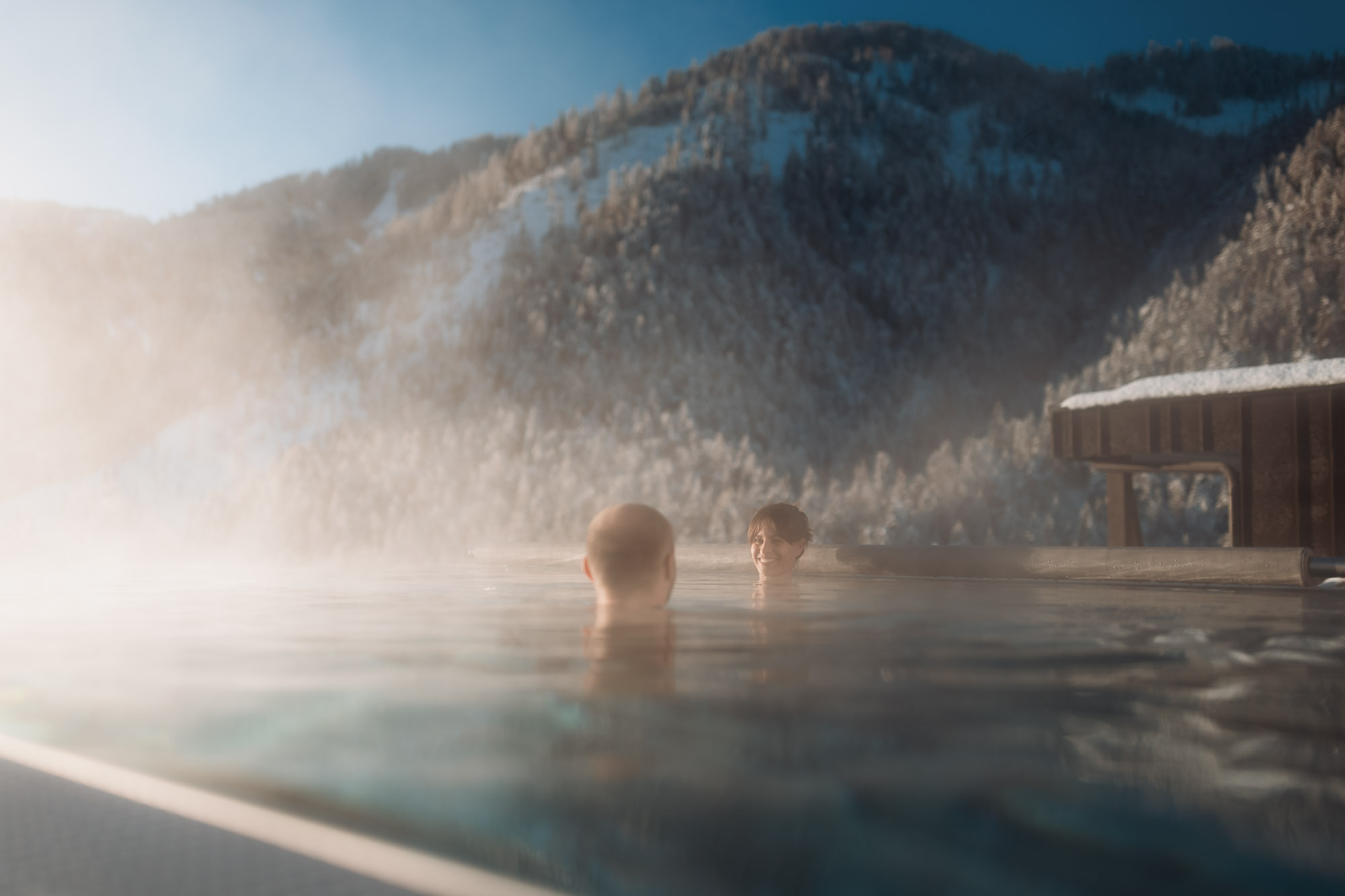 Circondati da momenti di spa: Godetevi la vista sulla natura. Il nostro bagno turco, la sauna finlandese e la sauna a infrarossi si trovano all’ultimo piano e offrono una vista indimenticabile sulle montagne circostanti. La nostra area benessere dispone inoltre di comodi lettini, letti ad acqua e docce emozionali. Dopo la sauna, vi coccoleremo con la nostra deliziosa acqua di sorgente, una tisana rinfrescante o mele locali.